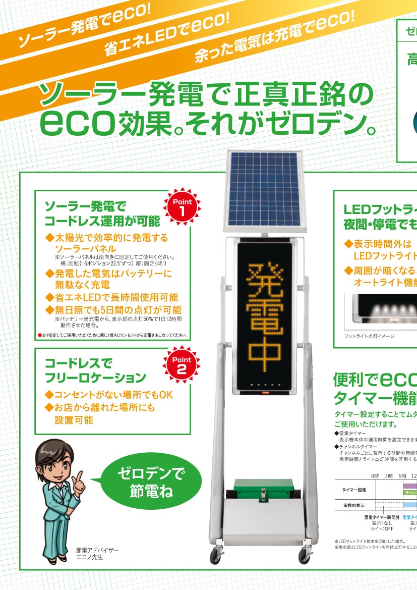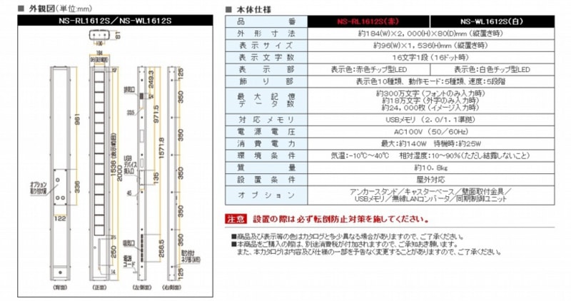 5000カンデラ/㎡以上(正面・白・最大輝度時)の高輝度で屋外でもしっかりとアピールできます。またチップ型LEDで非常に広い視野角(水平140°/垂直90°)を誇ります。